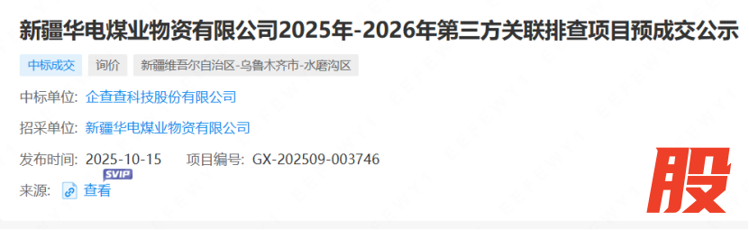 近日,企查查科技股份有限公司中标新疆华电煤业物资有限公司2025年-2026年第三方关联排查项目,招采单位为新疆华电煤业物资有限公司,采购方式为公开询比采购。据悉,新疆华电煤业物资有限公司为中国华电集团有限公司全资孙公司。