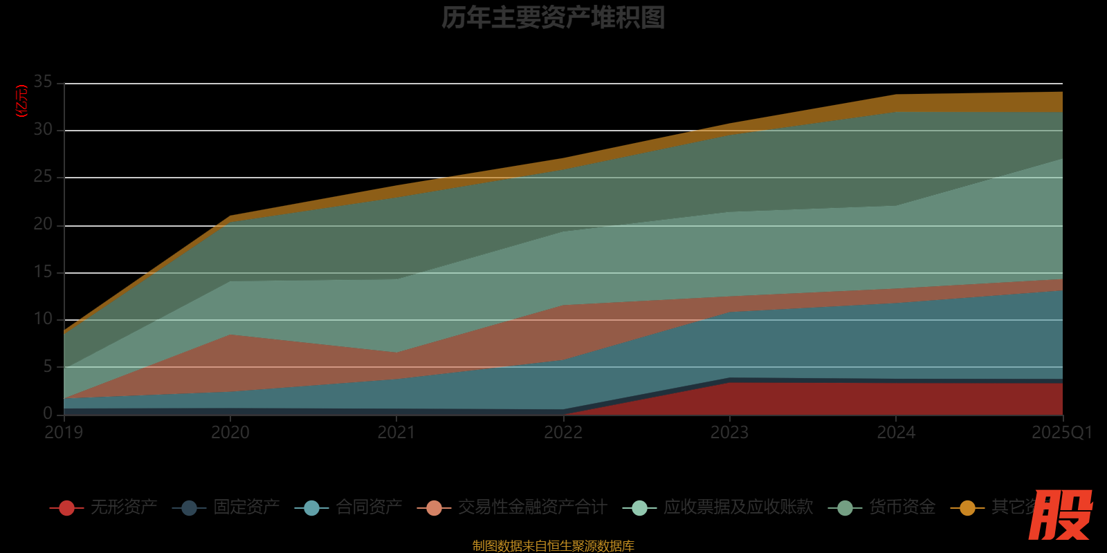 资产重大变化方面,截至2025年一季度末,公司货币资金较上年末减少50.57%,占公司总资产比重下降14.91个百分点;应收票据及应收账款较上年末增加45.51%,占公司总资产比重上升11.47个百分点;合同资产较上年末增加17.04%,占公司总资产比重上升3.8个百分点;交易性金融资产合计较上年末减少21.72%,占公司总资产比重下降1.02个百分点。